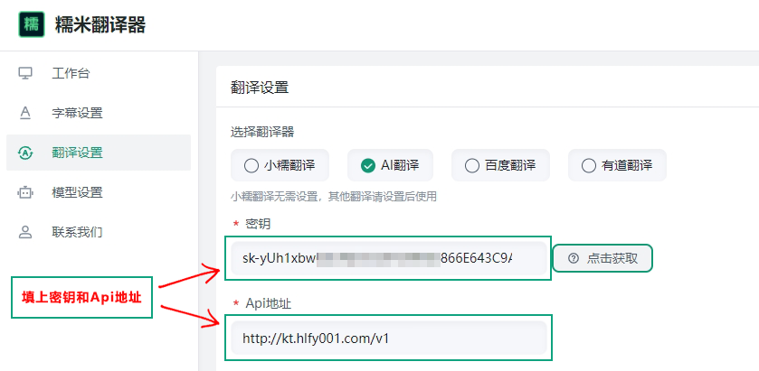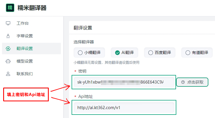 翻译设置处:填上 密钥 和 API地址 点击保存,就完成了!
